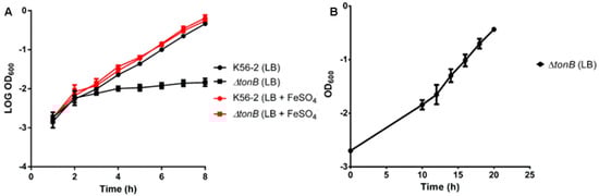 The tonB mutant strain GAP001 was characterized at several levels. First the growth rate was determined in LB media with and without 200 µM FeSO4. GAP001 showed adeficient growth in LB media alone (Figure 1A,B), compared with the wild type strain. However, when the media was supplemented with free iron, the growth rate of the GAP001 strain was indistinguishable from the wild type strain (Figure 1A).