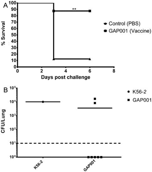 Anesthetized BALB/c mice (n = 8 per treatment) were given a series of two i.n. immunizations, at two week intervals, with PBS or 5 × 107 CFU of GAP001 resuspended in PBS in a total volume of 50 μL (25 μL/ naris). Mice were challenged 14 days after the second boost with 5 × 107 CFU of B. cenocepacia K56-2 NacR, diluted in PBS in 50 μL (25 μL/ naris). Mice were monitored and deaths were recorded until the end of the study. Survival curves were generated and analyzed using the Kaplan–Meier method. Significant differences (p ≤ 0.0005) were ascertained via a log rank test.