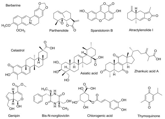 Artesunate (AS) (Figure 3), a hemisuccinate derivative of dihydroartemisinin soluble in water, promoted to the decrease of TNF-α and IL6 levels in mouse peritoneal macrophages induced LPS, or heat-killed E. coli [109]. Pretreatment of Kunming mice with AS significantly decreased mortality and delayed the time of death. Endotoxin and TNF-α levels were also decreased dose-dependently. The suppression of TLR4/MyD88/NF-κB signaling pathway by AS was also observed in murine BV2 microglial cells [110]. The natural compound artemisinin (Figure 3), a precursor of AS, have also demonstrated a similar activity in vivo [111].