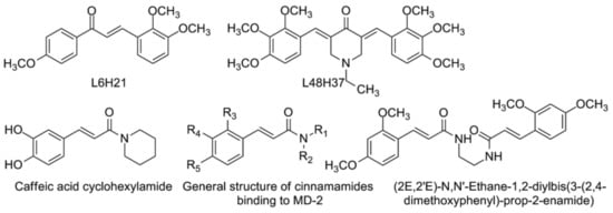 A series of structurally related compounds (Figure 7) sharing the cynnamoyl fragment are known as MD-2 binders. Trimethoxychalcone L6H21 improved the survival of C57BL/6 mice after LPS administration as compared to untreated animals [138]. Binding to MD-2 was confirmed by surface plasmon resonance (SPR). Similar chalcones were effective in the LPS-induced acute lung injury model [139]. L48H37 was rationally designed as a curcumin analogue (Figure 7): it is stable under physiological conditions and binds to MD-2 [140], as confirmed by fluorescence spectroscopy and surface plasmon resonance (SPR) assays. Male C57BL/6 mice were injected with 200 μL of LPS (at 20 mg/kg i.v.) 15 minutes before (for treatment) or after (for prevention) the administration of L48H37 (10 mg/kg i.v.). After seven days, both treatment and prevention groups have shown significantly better survival (p < 0.01) than LPS-injected animals. Curcumin itself has proven effective on TLR4-signaling [141,142,143]. The recent meta-analysis of randomized controlled trials (609 subjects overall) has shown that curcumin consumption significantly decreases IL-6 plasma levels, especially by system inflammation [144].