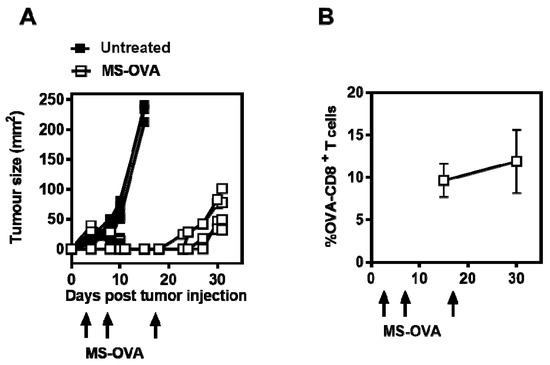 At various time points (pre-vaccination, 1-week post-vaccination, and at regular intervals throughout the course of the study) blood (50–100 µL) was collected via submandibular venipuncture for FACS analysis. At 33 and 37 days post tumor injection in MS-OVA treated mice blood, tumor, spleen, and lymph nodes were collected and processed for FACS analysis. Spleen and blood samples were processed as described previously [16]. Lymph nodes were processed by mashing between the frosted ends of two glass slides in RPMI 1640 medium (Invitrogen, Life Technologies, Grand Island, New York, NY, USA) supplemented with 8% fetal bovine serum (FBS) (HyClone Laboratories, Logan, UT, USA) (R8) and passed twice through a 45-μm Falcon cell strainer. Cells were washed by centrifugation at 400× g for 8 min and finally re-suspended in 0.5 mL of R8 medium. Subcutaneous tumors were excised in R8 medium, cut into small pieces, and digested with sterile dissociation cocktail comprising a final concentration of 1 mg/mL of collagenase type 4 (Worthington Biochemical Corporation, Lakewood, NJ, USA), and 0.1 mg/mL of hyaluronidase (Sigma-Aldrich, Oakville, ON, Canada). Samples were incubated for 1 h in a 37 °C shaking incubator, and then passed through a 45-μm falcon cell strainer (BD Biosciences, Franklin Lakes, NJ, USA). Cells were centrifuged at 400 × g for 8 min at RT and resuspended in 5 mL PBS + 1% BSA. Cells were strained and washed repeatedly until there were no visible clumps. Lymphocytes were isolated by PercollTM density gradient centrifugation. Briefly, a gradient was prepared by successively layering 40% and 70% Percoll density solutions, and cells in PBS were layered on top. Samples were centrifuged at 800× g for 25 min at 4 °C. The lymphocytes were collected from the lower interphase, thoroughly washed in PBS, centrifuged, and resuspended in R8 medium. The low-density tumor cells were found concentrated in the upper interphase. Live cell number was enumerated by trypan blue exclusion using a hemocytometer. Single cell suspensions were first blocked with an anti-Fc receptor antibody (α-CD16) for 5 min at 4 °C. Whole blood and single cell suspensions were stained with antibodies against CD8+ , IL-7Rα, CD62L, and PD-1 as well as with the MHC tetramer H-2KbOVA. All antibodies were obtained from BD Biosciences (Mississauga, ON, Canada). The H-2KbOVA-tetramer was obtained from Beckman Coulter (Mississauga, ON, Canada). Blood samples were treated with RBC lysing buffer (Sigma-Aldrich Oakville, ON, Canada) after antibody staining. Cells were washed with PBS, fixed with 0.5% paraformaldehyde, and acquired on a BD FACS Canto analyzer (Becton, Dickinson and Company, Franklin Lakes, NJ, USA). FSc vs. SSc gating was used to locate lymphocytes, exclude doublets, and exclude debris and dead cells. A further gate was set to identify CD8+, and the MHC tetramer H-2KbOVA+ cells. Single stained antibody controls were used to set compensation values between channels to prevent overlapping signals creating false-positives. Additionally, fluorescence minus one (FMO) gating controls were used. Flow cytometry data were analyzed using the FACS Diva® software (Becton, Dickinson and Company, Franklin Lakes, NJ, USA).