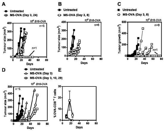 Optimizing MS-OVA treatment. C57BL/6 mice were given 106 B16-OVA tumor cells s.c. in the dorsal flank, MS-OVA was given s.c. at the base of the tail on (A), day 3 and 24 or (B) day 3 and 8, and tumor growth was measured over time. Alternatively, a reduced number of tumor cells, 105 of B16-OVA, were injected followed by MS-OVA treatment on (C) day 3 and 8, (D) day 3, or day 3, 10 and 29, and tumor growth was measured. The mean frequency ± SD of OVA-CD8+ T cells was compared in mice treated with MS-OVA on day 3 vs. days 3, 10, and 29 (E).