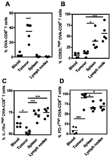 Programmed cell death protein-1 (PD-1) is upregulated on activated CD8+ T cells [32] and its maintained expression mediates the down-regulation of CD8+ T cell cytotoxicity and is thought to play a role in the immune evasion of tumors [33]. To characterize the phenotype of OVA-CD8+ T cells after MS-OVA therapy, mice were pre-dosed with OT.1 splenocytes to increase the basal frequency of OVA-specific CD8+ T cells, thereby increasing the frequency of responding OVA-specific CD8+ T cells. After tumor development, mice were sacrificed and blood, spleen, tumor and lymph nodes were taken to analyze tissue-resident OVA-specific CD8+ T cells and their phenotype. In MS-OVA treated mice, there was an increased frequency of OVA-specific CD8+ T cells in the tumor compared to the spleen, tumor-draining lymph nodes and the blood (Figure 5A). Surface expression of CD62L and IL-7Rα was significantly higher in OVA-specific CD8+ T cells in the spleen and lymph nodes compared to the tumor (Figure 5B,C). Most, interestingly a significantly increased expression of PD-1 was observed in infiltrating OVA-specific CD8+ T cells compared to other sites (Figure 5D). Additionally, PD-1 expression was significantly lower on blood resident CD8+ T cells. Since PD-1 upregulation has been correlated with diminished T cell function [34], this could represent a loss of tumor control and may account for loss of CTL function and resurgence of tumor after MS-OVA therapy.