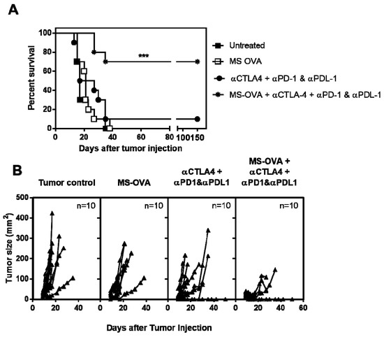 To address the question of whether T cell inhibitory receptors or ligands, such as PD-1, CTLA-4 and PD-L1, were responsible for the impaired OVA-CD8+ T cell function and resumed tumor growth, we next evaluated whether antibody therapy targeting these molecules would enhance the efficacy of MS-OVA therapy in B16-OVA tumor-bearing mice. B16-OVA bearing C57BL/6 mice were treated on day 3, 8, and 18 after tumor injection with both MS-OVA (day 3, 8 and 18) and/or αCTLA-4 (day 3, 8, and 18) and/or αPD-1/αPD-L1 (day 9, 12, 15, and 18). We chose to use both αPD-1 and αPD-L1 to block the entire PD-1/PD-L1 pathway as each molecule is known to bind to other ligands mediating immunosuppression [35,36]. Survival was significantly improved when MS-OVA archaeosomes were used in combination with checkpoint inhibitors with best responses obtained with a combination of MS-OVA archaeosomes + αCTLA-4/αPD-1/αPD-L1 (Figure 6). Indeed, using this combination, 70% of animals survived beyond 80 days compared to a median survival of 21 and 22 days for MS-OVA or αCTLA-4/αPD-1/αPD-L1 checkpoint inhibitor therapy alone, respectively. Weaker responses were obtained with MS-OVA + αCTLA-4 (median survival = 32 days), MS-OVA + αPD-1/αPD-L1 (median survival = 34 days ), αCTLA-4 alone (median survival = 23 days), or αPD-1/αPD-L1 (median survival = 18.5 days) (data not shown).