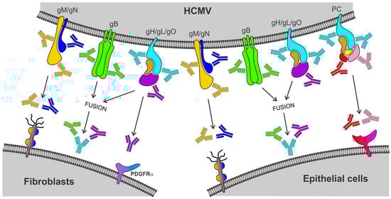 - Kabanova, A.; Marcandalli, J.; Zhou, T.; Bianchi, S.; Baxa, U.; Tsybovsky, Y.; Lilleri, D.; Silacci-Fregni, C.; Foglierini, M.; Fernandez-Rodriguez, B.M.; et al. Platelet-derived growth factor-alpha receptor is the cellular receptor for human cytomegalovirus ghglgo trimer. Nat. Microbiol. 2016, 1, 16082. [Google Scholar] [CrossRef] [PubMed]