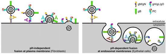 - Sathiyamoorthy, K.; Chen, J.; Longnecker, R.; Jardetzky, T.S. The complexity in herpesvirus entry. Curr. Opin. Virol. 2017, 24, 97–104. [Google Scholar] [CrossRef] [PubMed]