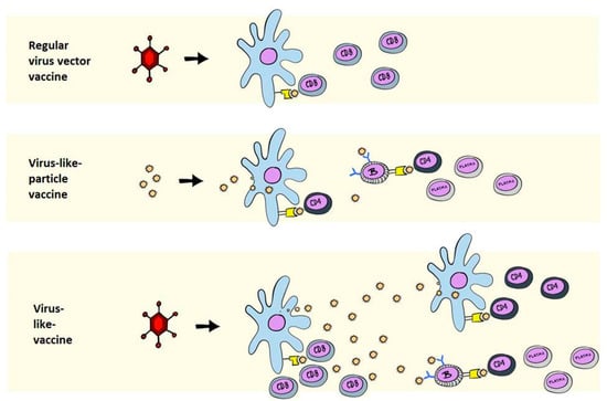 VLVs are simply VLPs encoded within a replication deficient viral vector. Upon vaccination, the viral vector infects antigen presenting cells (APCs) to induce direct antigen presentation of the encoded antigen on MHC class I, leading to the triggering of CD8+ T cells [23]. Next, the infected APCs produce VLPs, which are secreted and can be presented to dendritic cells and B cells for further triggering of CD4+ T cells, CD8+ T cells, and antibody responses [16,23]. Compared to VLVs, VLPs generally contain scant genetic material and only induce limited innate immune activation, but can be engineered to increase such activation by including TLR ligands or other adjuvants [24]. Compared to DNA-encoded VLPs, viral delivery differs in the induction of more innate inflammation, the efficient direct targeting of dendritic cells, and the delivery of excess vector-derived antigen, which may contain helper T cell epitopes. The latter, admittedly, comes with a caveat, as these vector epitopes are also generally off-target with regard to the desired vaccine-induced protection (discussed in detail in Fougeroux et al. [25]). Overall, several key properties of individual types of VLVs, including strengths and limitations, follow the vector type used to encode VLPs, but there are differences during repeated administration that will be discussed in the following sections [26,27].
