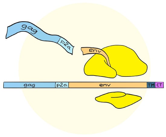 Design of the single frame transgenic cassette in adenoviral VLVs. The viral VLP-forming Gag protein is synthesized in-frame with the Env antigen, but separated with a self-cleavable peptide. This produces Gag and Env or any other downstream antigen in a 1:1 ratio.