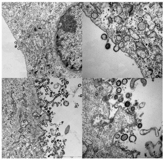 Secretion of VLPs from vector transduced cells. Vero cells infected with VLVs, then fixed, embedded, sectioned, and stained for transmission electron microscopy. The right-side micrographs depict higher magnification of the overview images to the left. The scale bar is visible at the lower right of the bottom micrographs. Specific experimental conditions were as described in Andersson et al. 2016 [7].