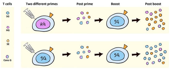 Graphic illustration of the results obtained in Andersson et al. 2016 [46]. The left panel depicts the T cells with specificity for SIV Gag (SG), HIV Gag (HG), SIV Env (SE), or with dual specificity for HIV and SIV Gag (Cons G). The priming expands the T cells with relevant specificities (mid-left). Booster immunization results in the expansion of SIV Env-specific T cells when heterologous gag is applied, and the expansion of SIV gag, including cross-reactive Gag-specific T cells, when a homologous Gag immunization is applied. Thus, in the face of Env antigen competition, boosting of cross-reactive Gag-specific T cells is inhibited.