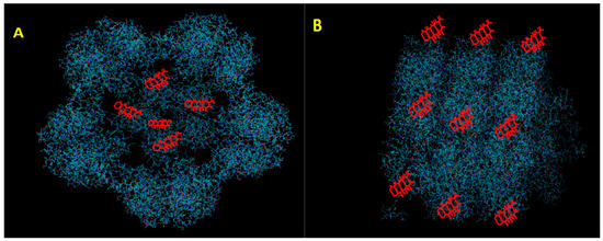 Schematic diagram of plant virus nanoparticles associated with Doxorubicine (DOX). In this diagram, DOX is oversized for visualization. (A) DOX residing within internal cavity of an icosahedral virus (B) DOX conjugated to the outer surface of a helical virus.