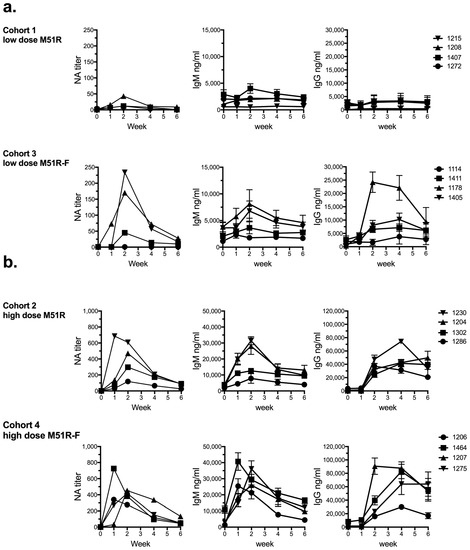 Humoral immune response. Plasmas were analyzed before vaccination (week 0, pre-immune) and at weeks 1, 2, 4 and 6 post-vaccination for anti-VSV antibodies. Neutralizing antibody (NA) titer (left panel) was defined as the dilution of serum that inhibited infection of mouse EL4 cells with M51R-eGFP by 50%. IgM (middle panel) and IgG (right panel) levels are expressed in ng/mL (mean ± SD, triplicate values), measured by ELISA with extrapolation from standard curves. Data for low dose (a) and high dose (b) vaccinations with M51R and M51R-F are shown. Note scale differences for low and high dose data. Statistical significance was determined by two-factor analysis of variance with cohort and time as the two factors. For all three antibody types, statistical significance of p < 0.05 (after correction for multiple comparisons) was obtained for comparisons of cohort 1 versus cohort 3 (low dose M51R vs. M51R-F), cohort 1 versus cohort 2 (low dose M51R vs. high dose M51R), and cohort 3 versus cohort 4 (low dose M51R-F vs. high dose M51R-F), but not for cohort 2 versus cohort 4 (high dose M51R vs. high dose M51R-F). The data shown represent 1 of 2 analyses with similar results performed on plasma from each animal.