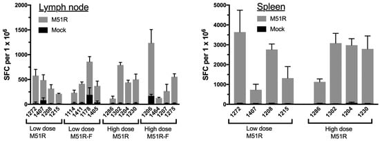 Cellular immune response in lymph node and spleen. Cells from the 6 week right axillary lymph nodes were re-stimulated with autologous APC infected with M51R VSV, and IFNγ production was measured by ELISPOT (gray bars). The number of spot-forming cells (SFC) per 106 lymph node responder cells is shown for each animal (mean ± SD, triplicate values). Data from responder cells restimulated with mock-infected APC are shown by the black bars. The same experiment was done with spleen cells (right panel) from low and high dose M51R-vaccinated animals (cohorts 1 and 2, respectively). For both lymph node and spleen experiments, no significant differences between the 4 cohorts were found by ordinary one-way ANOVA (p > 0.05).