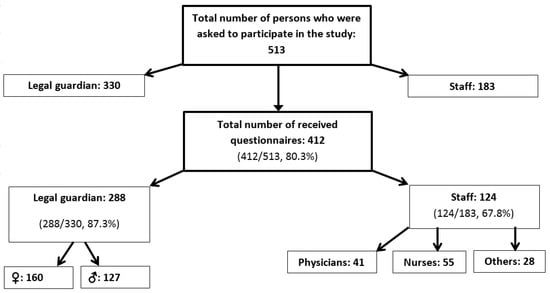 During the study period, 513 persons were informed about, and asked to participate in the study, of which 330 were parents, representing 47.8% of 690 eligible parents and 183 were HCP representing 90.6% of 202 eligible HCP. We received back 80.3% (412/513) of the questionnaires: 87.3% (288/330) from all parents, 55.7% (160/287), of which were female, 44.3% (127/287) were male; and one survey with no gender information. We received 67.8% of the surveys (124/183) provided to all HCP, including 44.3% (55/124) from nurses, 33.1% (41/124) from physicians; and, 22.6% (28/124) from other staff-members like physiotherapists, paramedics, and cleaning personnel, for example (Figure 1).