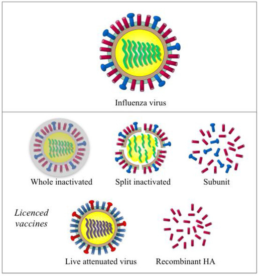 Current influenza vaccines come in three types (inactivated, live attenuated, and recombinant-HA) and are designated to different populations (Figure 1). More than 140–170 million doses have been distributed annually in the US during the last five years [8].