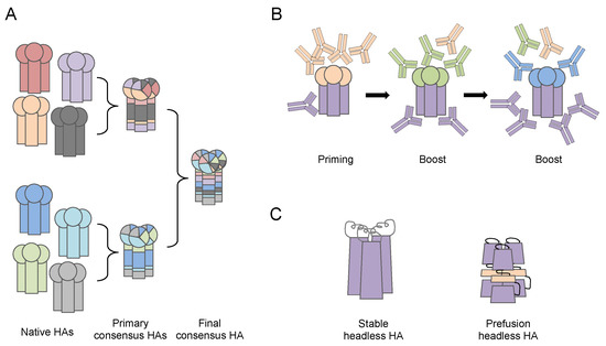 Illustration of antibody targeting next generation influenza vaccine designs. (A) Computationally optimized broadly reactive antigens (COBRA) strategy generates primary consensus hemagglutinin (HA) amino acid (aa) sequences from HAs of native circulating influenza strains, and further secondary and final consensus HA aa sequences from the primary consensus HAs based on a computational algorithm and antigenic evolving analysis. The de novo HA proteins with consensus aa sequence can be displayed on virus-like-particles or rescued influenza viruses using reverse genetics. (B) Chimeric HA. Conserved HA stalk domain from a circulating virus is combined with an irrelevant HA head domain from viruses that are absent in humans. The priming-boost-boost immunization regimen enhances immunogenicity of the subdominant HA stalk, thus elicits cross-reactive stalk specific antibodies. (C) Stable and pre-fusion Headless HA. Mini-HA proteins are engineered to have a correct-folded structure of the stable or pre-fusion stage of HA protein stalk domain. The immunogenicity of HA stalk is greatly enhanced by removing the HA head domain entirely.