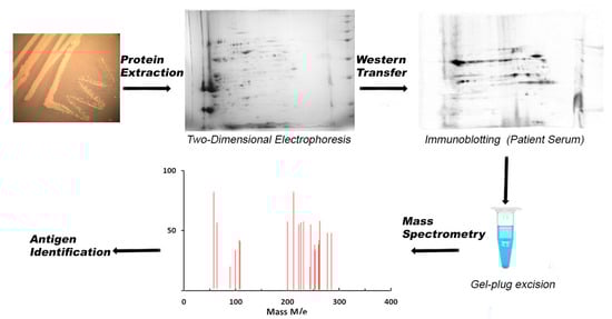 Immunoproteome analysis is one of the most common proteomics-based techniques used to identify antigens of potential interest for vaccine development. This technique relies on the fractionation of protein samples by 2D-PAGE according to their isoelectric point (pI) and molecular mass (MW). After this fractionation, Western blot procedures are used to reveal the immunoreactive proteins. Immunoreactive proteins are then excised from the gel, processed, and identified by mass spectrometry techniques (Figure 1).