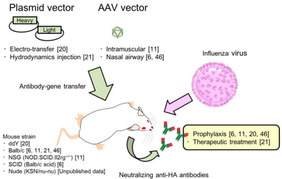 In vivo antibody gene transfer using plasmids or viral vectors (e.g., adeno-associated virus (AAV)) is one approach that has been developed to address this problem. In a recent review, Hollevoet et al. reported that the antibody gene transfer has been used for more than 20 years [,]. In 1995, the first peer-reviewed pre-clinical study was reported regarding an adenoviral vector coding antibody gene against HER2 (erbB2), which is a known oncoprotein and a target for breast cancer [,]. Through this approach, long-term neutralizing antibodies are produced by the host cells with only a single administration [,]. Gene-based mAbs are also cost-effective in terms of production, purification, and administration [,]. We have previously generated a plasmid encoding neutralizing mAbs against the HA of A/Puerto Rico/8/34 (A/PR8; H1N1) influenza virus []. We were able to induce potent and long-term expression of the mAbs in mouse serum [,]. All mice that received the plasmid encoding the neutralizing mAbs showed long-term prophylaxis and even therapeutic treatment of influenza [,]. Here, we will review a novel passive immunization method using antibody-gene transfer to protect against influenza virus infection and discuss perspectives for clinical applications.