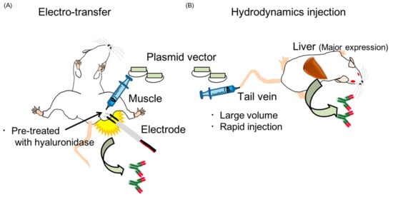 Here, we will also review another method of gene transfer, i.e., hydrodynamics injection (Figure 2B). In 1999, Liu and colleague demonstrated an innovative gene transfer method by hydrodynamics injection involving the rapid injection of a large volume of plasmid-DNA solution into mice through the tail vein []. This methods targets the liver and the peak expression was reached within 8 h after the gene transfer []. A remarkable study by Kitaguchi et al. indicated that the hydrodynamic injection of a plasmid encoding antibody genes could induce higher expression levels of the antibody than the electro-transfer method []. We confirmed this result within 5 days following the antibody gene transfer. We detected expression of the neutralizing antibody in the serum only 4 h after hydrodynamic injection, followed by peak expression of over 10 µg/mL []. However, Kitaguchi et al. also demonstrated that the expression level by hydrodynamic injection rapidly decreased after 40 days following gene transfer, while gene expression by electro-transfer was stable for at least 100 days. Therefore, hydrodynamics and electro-transfer are considered the best methods for short-term therapeutic treatment and long-term prophylaxis, respectively, against influenza virus infection.
