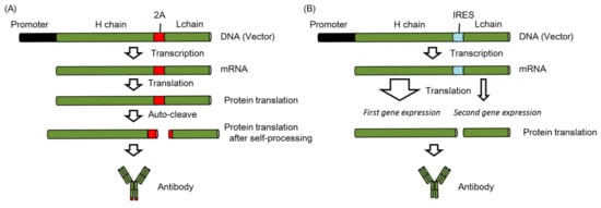 To obtain higher expression of the mAb, Kitaguchi et al. previously modified the antibody expression cassettes []. They showed that the highest expression was from a plasmid encoding genes for both the light and heavy chains, followed by two separate plasmids encoding either the light or heavy chain gene. They also demonstrated that expression using a single promoter (the CMV) was 5-fold higher than with different promoters (the CMV and EF-1) []. Moreover, Fang et al. indicated that stable antibody expression at therapeutic levels could be maintained using the 2A peptide sequence located between heavy chain gene and light chain [] (Figure 3A). The 2A peptide is derived from the foot-and-mouth-disease virus and can undergo self-cleavage to generate two proteins, which are full-length antibodies from a single open reading frame []. They indicated that the AAV vector encoding the antibody gene that included the 2A peptide could induce 16-fold higher mAb expression than the vector that included internal ribosomal entry sites (IRES) [], in which the second gene expression was significantly lower than the first gene expression [] (Figure 3B).