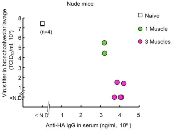 As shown in previous paragraph, electro-transfer is effective in normal mice. A pre-clinical study has evaluated the efficacy of anti-influenza enriched hyperimmune intravenous immunoglobulin (IVIG) using SCID mice, which have severe immunodeficiency due to lack of functional B and T lymphocytes []. This research suggests that passive immunization is an effective strategy for use in immunocompromised patients. Balazs et al. demonstrated that intramuscular inoculation of AAV9 vector encoding the broadly neutralizing influenza antibody induced a prophylactic effect against a lethal dose of influenza virus in young mice (between 14 and 19 weeks of age), old mice (between 46 and 55 weeks of age), and NOD.SCID.Il2rg−/− (NSG) mice that lack T cells, B cells, and functional NK cells [,]. Adams et al. also showed that airway inoculation with the AAV9 vector protected young, old, and immunocompromised (SCID) mice []. Using electro-transfer with our non-viral plasmid vector, we also determined that long-term protection was induced in nude (nu/nu) mice (unpublished data), which have a lower immune response against the influenza virus than normal mice [,]. The concentration of neutralizing antibodies in the serum reached approximately 103 or 104 ng/mL 130 days after the electro-transfer of the antibody gene into one muscle or three muscles (Figure 4). The viral titer in in bronchoalveolar lavage was reduced approximately 102- or 107-fold compared to naive mice (Figure 4). This research suggests that prophylactic approaches using antibody gene transfer may be effective in the protection of immunocompromised or elderly patient populations who currently receive limited protection from existing vaccines.