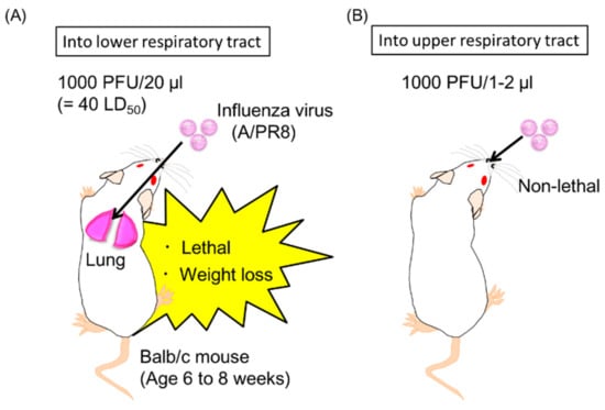 Mouse models of the influenza virus (A/PR8) infection []. (A) Into lower respiratory tract; (B) Into upper respiratory tract.
