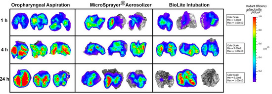| No significant differences in total flux/deposition of microparticles at 1, 4, and 24 h in whole animal and excised lungs, liver, spleen, and kidneys | |||
