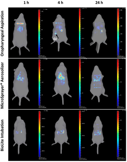 | 3D imaging shows microparticles reaching the GI tract at 4 and 24 h, indicating GI deposition along with tracheal and lung deposition | 3D imaging shows majority of the microparticle deposition in trachea and the lungs | 3D imaging shows majority of the microparticle deposition in trachea and the lungs | |