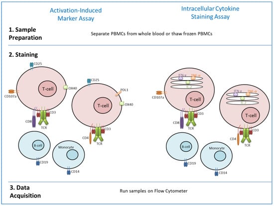 Another flow cytometry-based assay, which has recently been described, is the activation-induced marker (AIM) assay. This assay can be performed in a similar way to ICS (see Figure 1). However, rather than staining for intracellular cytokines, staining is performed for T-cell receptor-induced cell-surface markers including PDL1, CD25 and OX40. Different combinations of these markers were assessed for their ability to identify AIM+ T-cell populations []. Therefore, detection of antigen-specific T-cells is not dependent upon cytokine production, which may be very low in some T-cell subsets. The assay was initially developed to detect T-follicular helper cells, which are difficult to detect by ICS [], but can also be used for CD4+ T-cell assessment after exposure to antigen by vaccination or infection [,]. The use of an AIM assay in a vaccine clinical trial setting showed comparable sensitivity and specificity to ELISpot and ICS []. This study showed that AIM assays can be used to detect both CD4+ and CD8+ T-cells. Whilst CD8+ AIM responses correlated with CD8+ ELISpot and ICS responses, CD4+ AIM responses did not. This is likely due to the fact that AIM assays detect more CD4+ subpopulations, including Tregs and NKTs, compared with ICS which primarily detects CD4+ TEM. This study indicates that AIM assays can be used in vaccine studies to detect novel memory T-cell responses which are hard to enumerate by ICS alone.