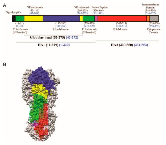 (A) Schematic view of the H5 influenza viral haemagglutinin (HA) protein showing the different motifs present in HA. The stalk domain can be further divided into the F’ (green) or F (red) subdomains, whereas the globular head consists of the receptor binding (RB) subdomain (blue) and (vestigial esterase) VE subdomain (yellow), followed by the fusion peptide (magenta), transmembrane domain (orange), and cytoplasmic domain (grey). Numbering is indicated in the H3 (black) and H5 (blue) formats; (B) The corresponding segments in 3D are shown as a surface contour representation of one of the protomers of the H5 trimer from A/Vietnam/1203/04 (VN04) (PDB ID: 2FK0).