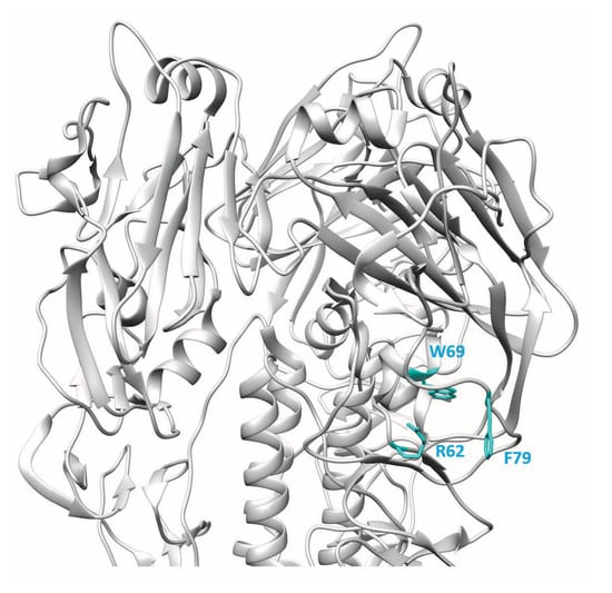 Epitope mapping of the mAb 9F4 was guided by analysis of antibody escape mutants and in silico antigenic prediction []. Sequencing of the escape mutants showed the presence of two mutations in the HA gene: R62 mutated to G and T163 mutated to S. Site-directed mutagenesis and binding assays showed that R62 was the critical residue making contact with mAb 9F4, whereas T163S was a passenger mutation. Other residues in HA that could be involved in the interaction with mAb 9F4 were predicted utilising in silico prediction methods and proximity of the predicted residues to R62. After carrying out binding analysis with the substitution mutants, two additional amino acid residues, namely W69 and F79, were also found to be important for the interaction between HA and mAb 9F4. Thus, the binding of mAb 9F4 requires at least three noncontinuous amino acid residues, namely R62, W69, and F79, which form an epitope in the VE subdomain of HA (Figure 2). Binding and neutralisation studies showed that R62 makes critical contact with mAb 9F4, whereas W69 and F79 may not directly interact with mAb 9F4, but may affect the stability of the conformational epitope in HA.