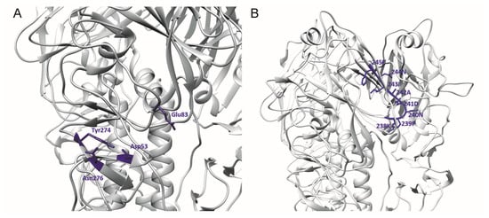 Previously, two mAbs—H5M9 [] and 4F5 []—were reported to interact with amino acid residues close to the binding site of 9F4. H5M9 was produced by immunising mice with the HA protein of A/goose/Guangdong/1/96 (H5N1). Crystal structures of H5M9 complexed with the HA protein of VN04 (H5N1) revealed that the antibody-binding epitope is located in the VE subdomain and is comprised of amino acids D53, Y274, E83, and N276 (Figure 3A).