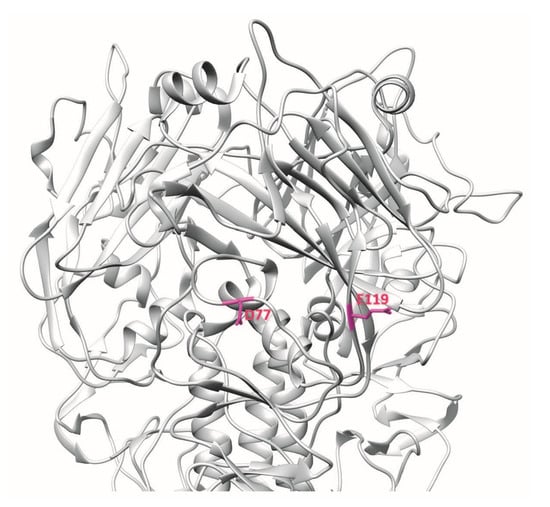 Another human mAb, 100F4, neutralises multiple clades of H5N1 and binds outside the receptor-binding subdomain of H5N1 HA [,]. Memory B cells from peripheral blood mononuclear cells of a patient who recovered from H5N1 infection were immortalised and culture supernatants were screened by HA pseudotype-based neutralisation assay. 100F4-producing hybridoma culture supernatant showed neutralisation activity against HA and neuraminidase pseudotype viruses of H5N1 A/Shenzhen/406H/2006. Hence, after one round of subcloning, total RNA was isolated and VH, Vκ, and Vλ gene segments were amplified by reverse transcription PCR and inserted into Drosophila S2 cell expression vectors containing constant regions of human γ1, κ1, and λ1 gene segments. Culture supernatants were harvested, and the human monoclonal antibodies in these culture supernatants were purified. 100F4 was reported to bind to amino acid residues at positions D77 and E119, which are found in the VE subdomain of H5N1 HA [] (Figure 5).
