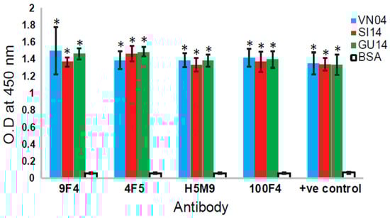 Analysis of the binding of different VE-binding mAbs to H5N6 HA. Ninety-six-well ELISA plates were coated with 100 ng/well of recombinant His-tagged HA protein from A/Vietnam/1203/2004(H5N1)(VN04), A/Guangzhou/39715/2014(H5N6)(GU14), and A/Sichuan/26221/2014(H5N6)(SI14) (purchased from Sino Biological, Beijng, China). Bovine serum albumin (BSA) was coated as negative control. In total, 1.25 µg/mL of each recombinant human and mouse–human chimeric antibodies (produced as described in [,]) were added. Anti-His mouse mAb was used as the positive control antibody. After incubation and washing, horseradish peroxidase-conjugated anti-mouse or anti-human IgG were added as secondary antibodies. After incubation and washing, the substrate 3, 3′, 5, 5′-tetramethylbenzidine was added, incubated until optimum development of colour, and stopped with 2 M sulphuric acid. The absorbance at 450 nm was measured. Three independent experiments were performed, and data is shown as the mean of 3 experiments ± SD. Two-tailed Student’s t-test was used to evaluate the significance of differences between sample sets. * Indicates statistically significant difference of p < 0.05 when compared to BSA.