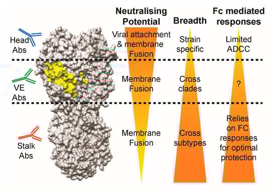 Anti-head antibodies are potent regarding the direct neutralisation of specific viral strains with limited Fc-mediating potential, while anti-stalk antibodies lose direct neutralisation potential, but gain additional breadth across viral subtypes and Fc-mediated responses in comparison. Taken together with the characteristics of head- and stalk-class antibodies, we speculate that most of the VE-targeting antibodies lie in the intermediacy in terms of neutralising potential and breadth when compared to head and stalk antibodies: (1) they possess direct viral neutralisation capabilities via the inhibition of membrane fusion, but not viral attachment; (2) they are able to protect across different strains within the same influenza subtype; and (3) they are able to stimulate Fc-mediated responses (Figure 7). Whether VE-binding antibodies identified in the future follow this trend remains to be determined.
