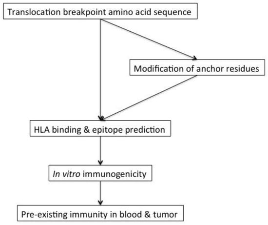 The first step towards the development of immunotherapies targeting translocation fusion proteins in ESS is to evaluate the immunogenicity of the translocation breakpoints, which is schematically explained in Figure 1. This encompasses evaluation of peptide binding to HLA molecules by available epitope prediction algorithms followed by testing of the predicted peptides in in vitro immunogenicity assays. In addition, it should be evaluated whether binding of the translocation breakpoint peptides to HLA molecules can be enhanced by modifying the peptides at known anchor residues that are important for binding to the different HLA molecules without losing recognition of the endogenous epitope expressed by the tumor cells.