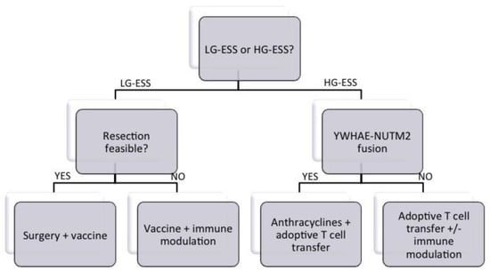 For HG-ESS tumors with the YWHAE-NUTM2 fusion, a combination of anthracycline treatment with adoptive T cell transfer might be a good choice, given the preliminary data of the sensitivity to anthracyclines of this subtype. Combination with other immunomodulatory agents might be warranted for HG-ESS, or in cases of bulk disease, to tackle tumor-induced immunosuppression. However, data on the infiltration of ESS tumors by immune cells or on the interaction between ESS and the immune system is mostly lacking. A recent study comparing ESS with undifferentiated uterine sarcomas showed that ESS contained significantly fewer myeloid cells and M2 macrophages []. Our own group documented high PD-L1 and B7-H4 expression in uterine sarcomas in general, but the numbers of ESS tumors (seven cases) in this study were too low to perform a subgroup analysis []. Thus, a comprehensive study on a sufficient amount of ESS patients is urgently needed to map the immune landscape of recurrent ESS tumors for the rational design of combination treatments.