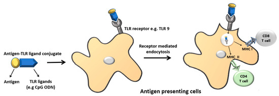 Illustration of ligand-based antigen targeting. Pattern recognition receptor (PRR) ligands can be conjugated to the antigen chemically or recombinantly. In most cases, Toll-like receptor (TLR) ligands have been used for antigen targeting. The TLR ligands have dual functions. They facilitate the targeting of antigens to antigen presenting cells (APCs) and also act as adjuvants. Once the antigen–PRR ligand conjugate binds to the respective receptor on antigen presenting cells, it undergoes receptor mediated endocytosis and is presented either via the MHC I or MHC II pathways. CpG ODN: CpG oligodeoxynucleotide.