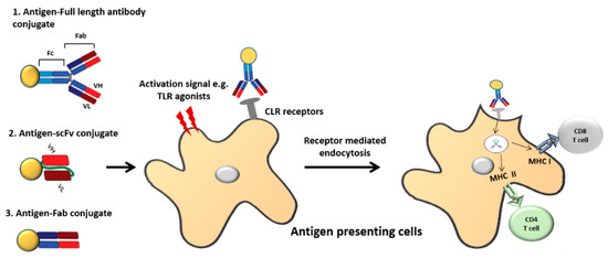 Illustration of antibody-based antigen targeting. The full antibody or antibody fragments such as Fab (fragment antigen binding), scFv (single chain fragment variable antibody) can be conjugated to the antigen chemically or recombinantly. In most cases, C-type lectin receptors (CLR) have been targeted for this purpose. Dendritic cell (DC) activation signals like Toll-like receptor (TLR) agonists are often required for protective immunity. Once the antigen–antibody complex binds to the respective receptor on antigen presenting cells, it undergoes receptor mediated endocytosis and is presented either via the MHC I or MHC II pathway.