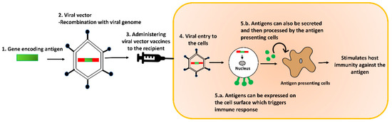 Illustration of viral vector vaccine delivery method. The gene encoding the antigen of interest can be introduced into the viral genome via recombination. The recombinant viral vectors can be administered to the recipient. Upon entry into the recipient cells, they release the viral genome into the cytoplasm. This results in the in vivo expression of the encoded antigen. The antigen can either be expressed on the cell surface, or secreted and then processed by antigen-presenting cells.
