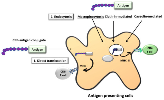 Illustration of the cell-penetrating peptide (CPP) delivery system. CPP are cationic peptides. CPP–antigen conjugates can be designed either chemically or recombinantly. CPP can undergo electrostatic interaction with the negatively charged cell surface glycoproteins under physiological condition. This facilitates the direct translocation of antigens across the cell membrane. Furthermore, CPP–antigen conjugates can also enter the cell by endocytosis. Direct translocation of the CPP–antigen conjugate allows antigen presentation via the MHC I pathway whereas entry by endocytosis facilitates the antigen presentation via the MHC II pathway.