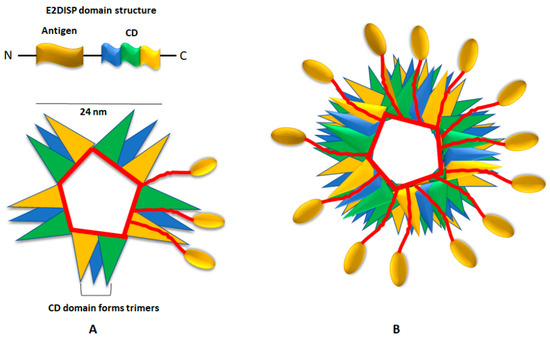 This is a novel antigen delivery system based on the pyruvate dehydrogenase (PDH) complex of Geobacilus stearothermophilus [63]. The PDH complex is made up of multiple copies of three different enzymes; E1, E2 and E3. E2 is a dihydrolipoyl acyltransferase enzyme composed of three independently folded domains separated by flexible linkers: a lipoyl domain (LD), a peripheral subunit binding domain (PSBD) and a catalytic acetyltransferase core domain (CD). The C-terminal CD of E2 can self- assemble into trimers, which aggregate to generate a pentagonal dodecahedral protein scaffold with icosahedral symmetry resembling a VLP (Figure 6) [83]. The exogenous peptides are displayed on the E2 scaffold by engineering plasmids that can allow the insertion of the exogenous oligonucleotides at the 5’ end of the gene encoding E2 CD. Such engineered E2 core is referred to as the E2 acetyltransferase display system (E2DISP) and it has an ability to display 60 copies of heterologous polypeptides on the E2 core surface [84]. One of the key advantages of this system is that the E2 core domain can naturally display 187 amino acid residues in the form of two folded protein domains (LD and PSBD) and two flexible linkers [63]. This facilitates the display of the full-length protein as antigen, which is more advantageous than displaying smaller peptides in terms of higher epitope diversity for antibody production and T cell induction. Furthermore, the display of 60 copies of an antigen of interest per E2DISP particle can stimulate a stronger immune response by triggering and cross-linking specific B-cell antigen receptor [63]. Studies have demonstrated that epitopes displayed on the E2 surface can elicit both B and T cell responses, indicating that E2DISP particle can process the displayed epitopes via both MHC I and MHC II pathways [85,86,87]. Factors such as stability, non-toxicity, low cost and lack of integration make E2DISP an attractive antigen delivery system.