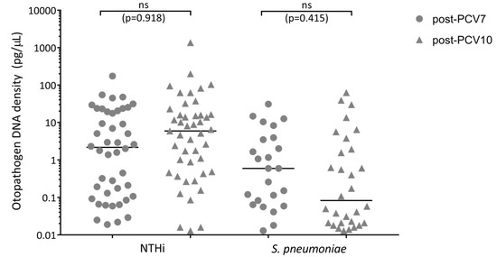 Otopathogen density in the middle ear of PCV7- and PCV10-vaccinated otitis-prone children with pneumococcal or NTHi OM. Data are presented for each child with an otopathogen detected in their middle ear, with each data point representing an individual child and the horizontal bars depicting the median otopathogen DNA concentration in pg/μL in the middle ear effusion. Circles represent PCV7-vaccinated otitis-prone cases and triangles represent PCV10-vaccinated otitis-prone cases. Statistical analysis was conducted on adjusted data, correcting for age and day-care attendance, ns: not significant. NTHi, nontypeable Haemophilus influenzae; PCV, pneumococcal conjugate vaccine.