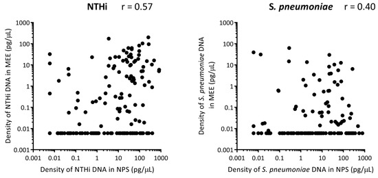 Correlation between otopathogen densities in the nasopharynx with otopathogen density in the middle ear of otitis-prone children. Each dot represents the density of nontypeable Haemophilus influenzae (NTHi) (A) and S. pneumoniae (B) in pg/μL of DNA in the nasopharynx (NPS) and middle ear effusion (MEE) of otitis-prone children. Correlation was assessed by Spearman rho, where 0.5 > r >0.3 is considered a weak positive correlation and 0.7 > r >0.5 is considered a moderate positive correlation.
