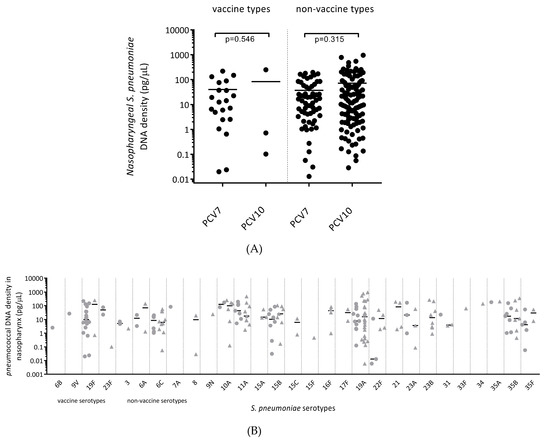(A) Pneumococcal vaccine and non-vaccine serotype carriage density in the nasopharynx of PCV7- and PCV10-vaccinated children. Data are presented for each individual child, with the horizontal bars depicting the median density of vaccine-types and non-vaccine types in pg/μL of pneumococcal DNA. (B) Serotype-specific carriage density in the nasopharynx of PCV7- and PCV10-vaccinated children. Data are presented for each individual child, with the horizontal bars depicting the median density of specific pneumococcal serotypes in pg/μL of pneumococcal (lytA) DNA. Circles represent PCV7-vaccinated children and triangles represent PCV10-vaccinated children.