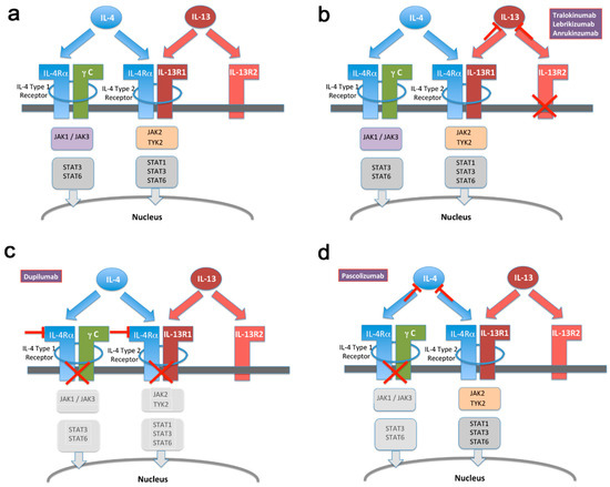 Several drugs targeting IL-13 are undergoing clinical development or already marketed. The precise efficacy, as well as adverse effect profile of each drug is related to its molecular mode of action. As shown in Figure 1a, IL-13 and IL-4 signal through partially overlapping pathways. Both cytokines will activate the so-called type-2 IL-4 receptor, followed by JAK2/Tyk2 phosphorylation and subsequent STAT translocation. By contrast, only IL-4 activates the type-1 IL-4 receptor, whereas IL-13 additionally binds to IL-13α2, commonly regarded as an inhibitory decoy receptor. By binding to IL-4Rα, dupilumab essentially abrogates signaling through both IL-4 and IL-13 (Figure 1b). In contrast, pascolizumab directly binds to IL-4, thereby preserving type-2 receptor activation via IL-13 (Figure 1c). This drug did not show clinical efficacy, thereby suggesting that the effect of this system on asthma and eczema pathogenesis primarily proceeds through the IL-4 type 2 receptor [65]. Finally, IL-13 selective antibodies (Figure 1d) prevent IL-13 binding but preserve the activation of both active receptor systems. The emerging clinical efficacy of these drugs both in asthma and atopic eczema suggests that the more selective inactivation of IL-13 achieves sufficient activity while preserving IL-4 activity, with a potentially important gain in safety profile in terms of immunity to infectious agents [9]. A number of selective as well as global JAK inhibitors are currently also being developed for atopic disease [66], as well as other conditions including cancer. However, the complex nature of precise JAK/STAT coupling of IL-4, as well as other signal transducing pathways [67], prevent an unambiguous mapping of specific adverse effects and/or activity profiles to relative IL-4/IL-13 signaling.