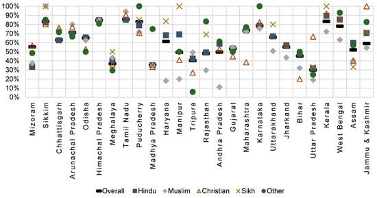 Religion and caste reflect cultural designations that influence parental beliefs and attitudes toward health-seeking behaviors including vaccination decisions about their children [,]. There are four major religions in India: the Hindu majority as well as Muslims, Christians, and Sikhs. Other groups, such as Buddhists, Jains, Jews, and Parsis, individually make up less than one percent of the total population. A previous analysis of DLHS3, which accounted for state-level differences, showed that compared to the majority Hindus, Sikh children had better and Muslim children worse vaccination outcomes []. Individuals in scheduled castes (SC) and scheduled tribes (ST) are subject to social discrimination and are historically less privileged than other backward castes (OBC), and “others,” who represent the most highly privileged caste grouping. Low caste status can impact the ability to access governmental services, including vaccination [,,,,]. However, previous studies have not taken into account the impact of state-level factors (like proportion from different religious groups or from SC/ST) on vaccination.