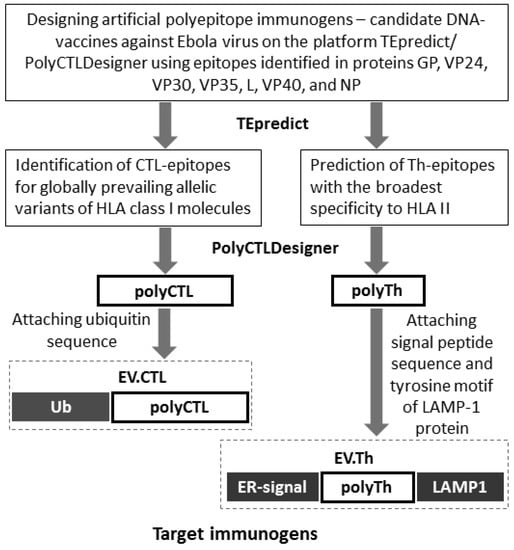 To design the target antigens, we used PolyCTLDesigner software that we had developed for rational design of artificial polyepitope vaccine constructs [26]. It enables us to calculate amino acid sequence of polyepitope antigen by detecting the best spacer sequences for each pair of epitopes and optimal relative positions of epitopes in the construct considering state-of-the-art knowledge about the specificity of proteasomal processing of antigens and interaction between peptides and TAP. The findings revealed that the designed artificial DNA vaccine constructs encoding CTL and Th-epitopes of Ebola virus antigens provide expression of the target genes, as well as induce virus-specific responses of CD4+ and CD8+ T-lymphocytes in immunized mice.
