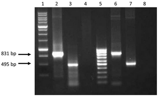 Electrophoregram on 1% agarose gel of PCR products: 1 - Molecular weight marker (M12, SibEnzyme); 2 and 3—PCR fragments of 831 and 495 bps obtained using cDNA as a matrix with primers (fCTL, rCTL) and (fTh, rTh), respectively; 4 and 8—The results of PCR with primers (fCTL, rCTL) and (fTh, rTh) and total RNA isolated from 293T cells transfected with plasmids pEV.CTL and pEV.Th, respectively (without reverse transcription; control for the absence of target plasmids in isolated samples of total RNA); 5—Molecular weight marker (M15, SibEnzyme); 6 and 7—PCR fragments obtained using plasmids pEV.CTL and pEV.Th as a matrix, respectively (positive control).