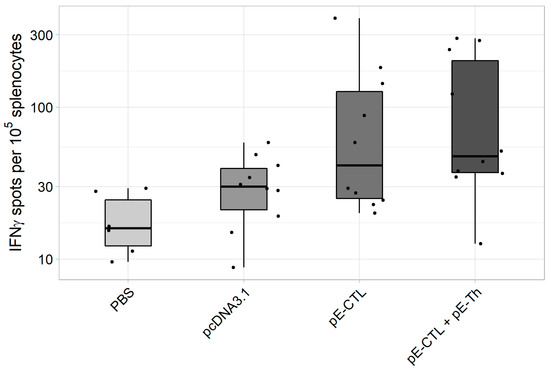 ELISpot results (Figure 4) demonstrate that the induction of specific response was registered in both experimental groups [pE-CTL+pE-Th] and [pE-CTL], especially in the animal group immunized with a mix of target DNA vaccine constructs [pE-CTL+pE-Th]. Significant differences from both negative controls were observed only in [pE-CTL+pE-Th] group (Table 3).